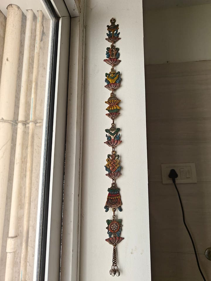 I hung up two beautiful wall hangings with Buddhist motifs that I had bought on my trip to Darjeeling in 2014. They frame the window now.