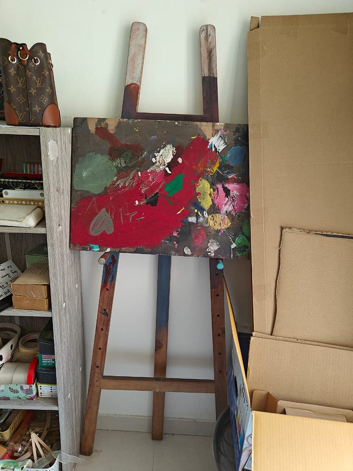 I rehomed my sister’s old easel. She doesn’t paint anymore, and I have been itching to create bigger paintings on an easel. The easel now stands next to the pottery wheel. The wooden board needs some work and love though. It’s a project I’m undertaking.
