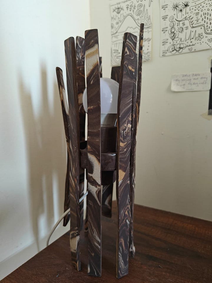 I fixed up the lamp I bought from a local potter, and finally plugged a bulb in. It sits pretty on my desk!